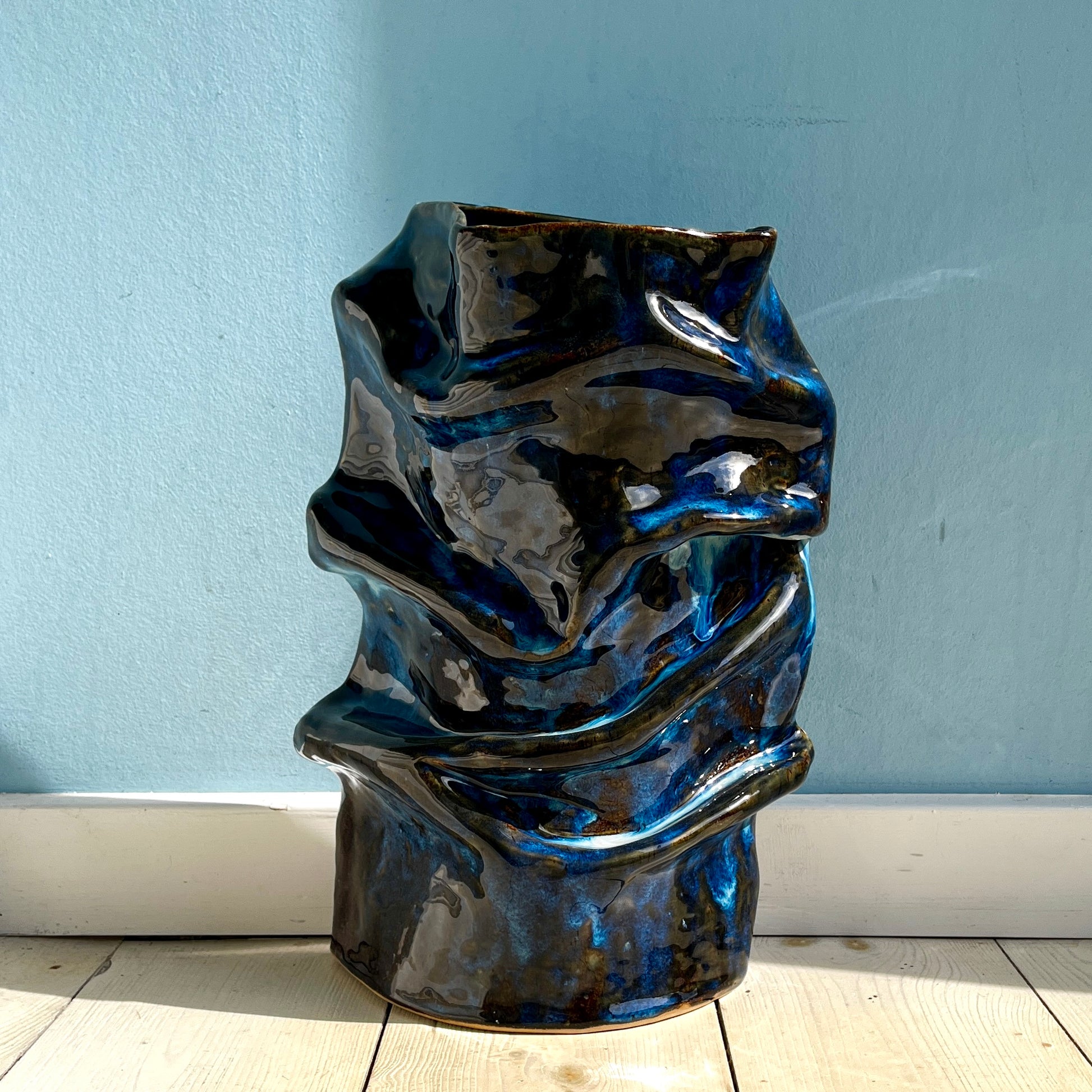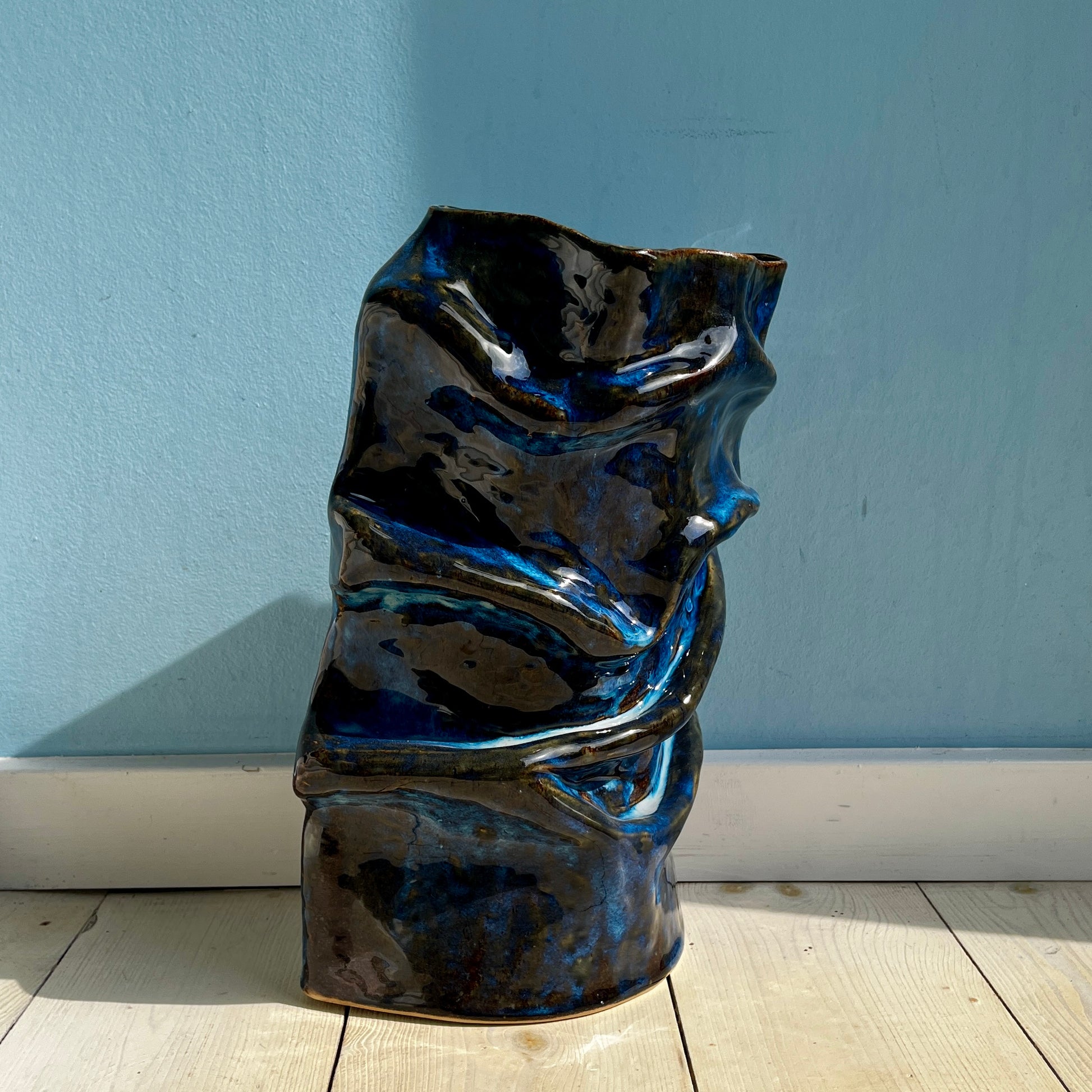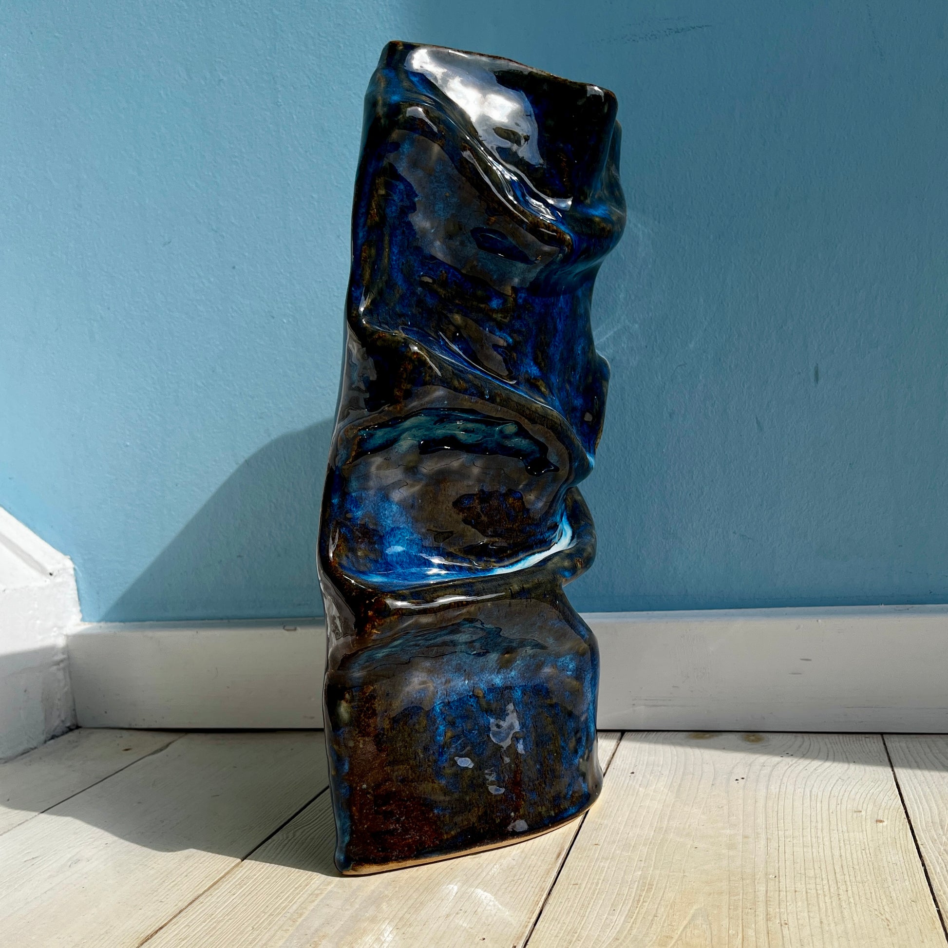 Håndlavet, krøllet, gulvvase i stentøjskeramik.