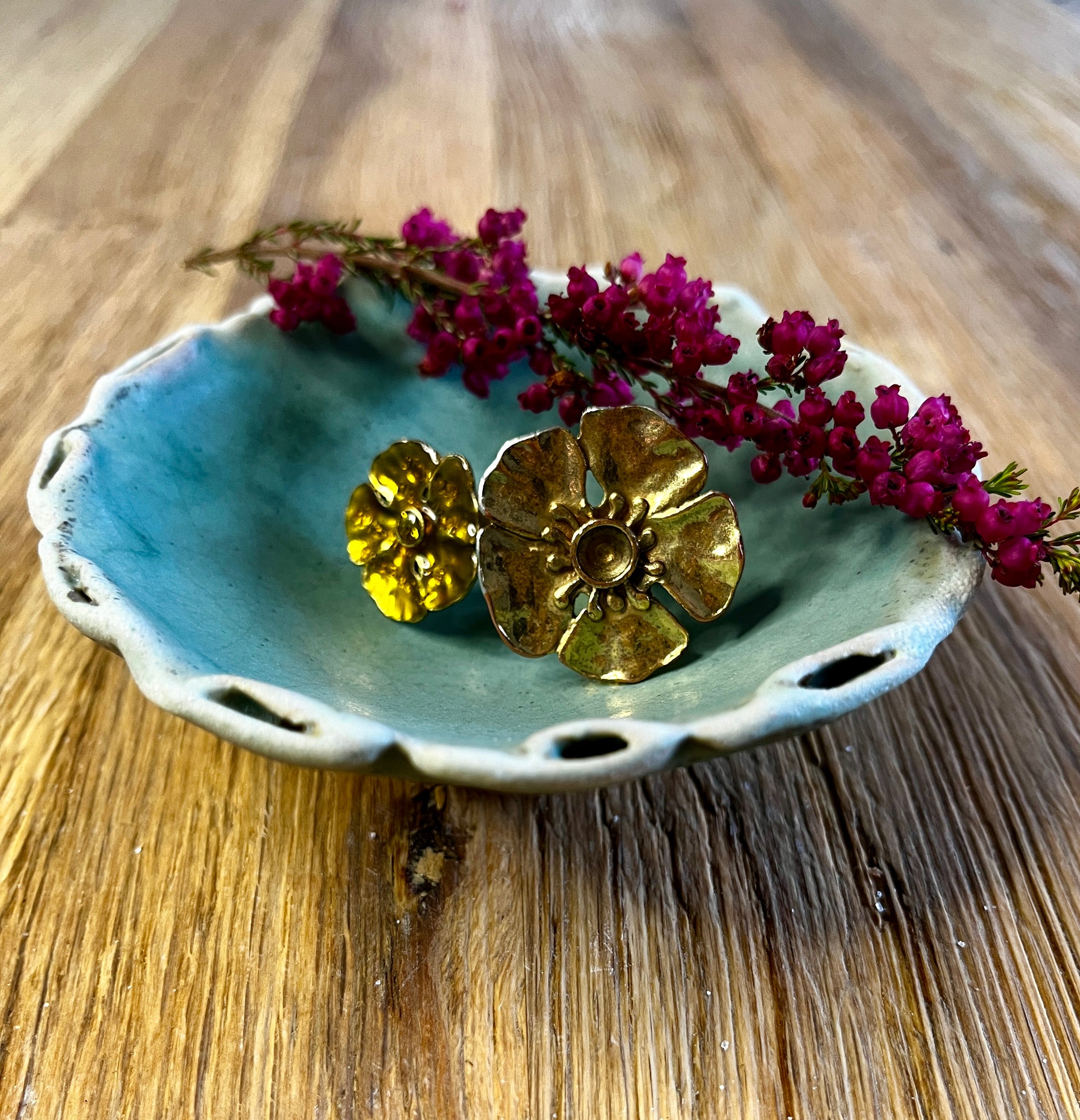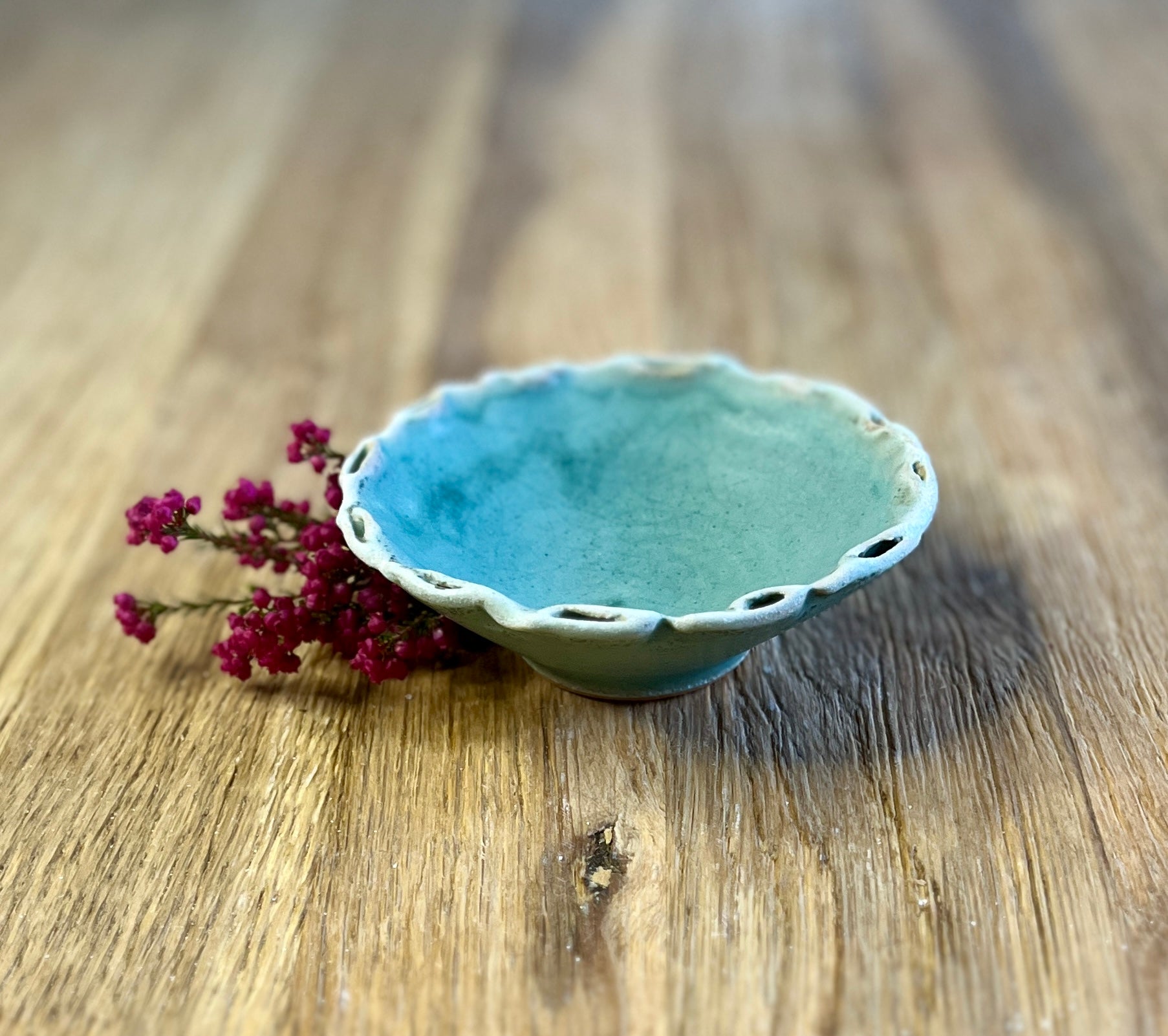 Lille skål, fx til at lægge smykker i. Skålen er hånddrejet i sort stentøjsler og glaseret med matgrøn glasur.