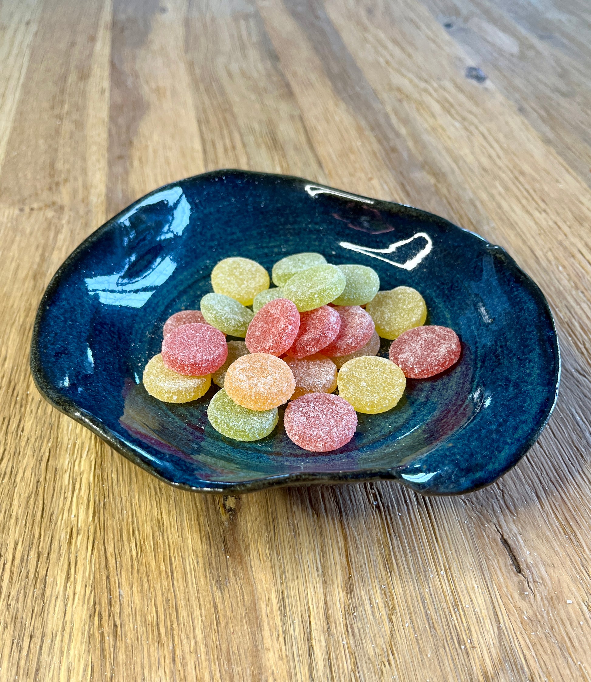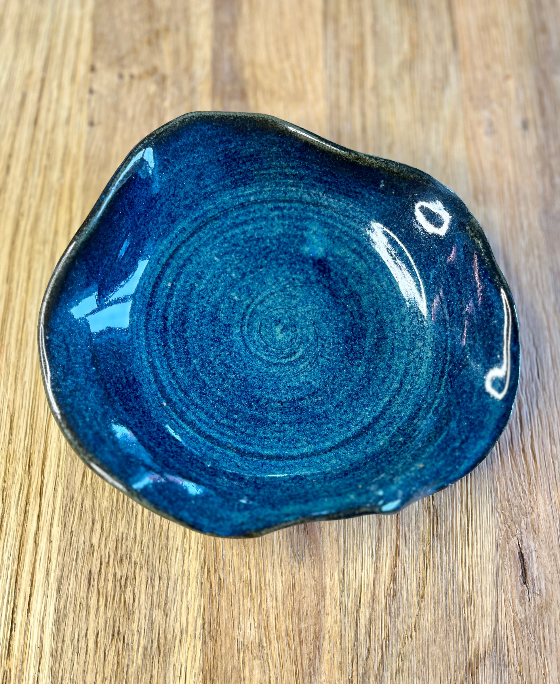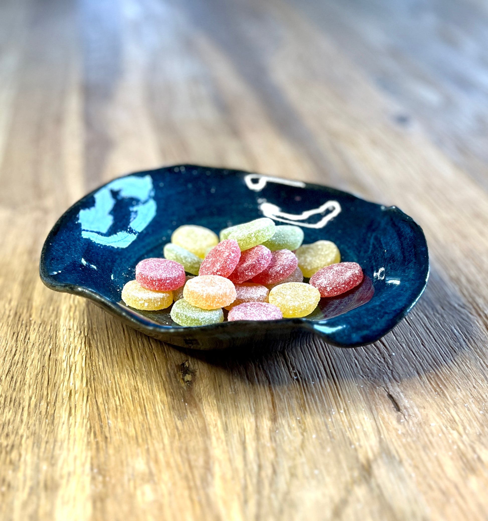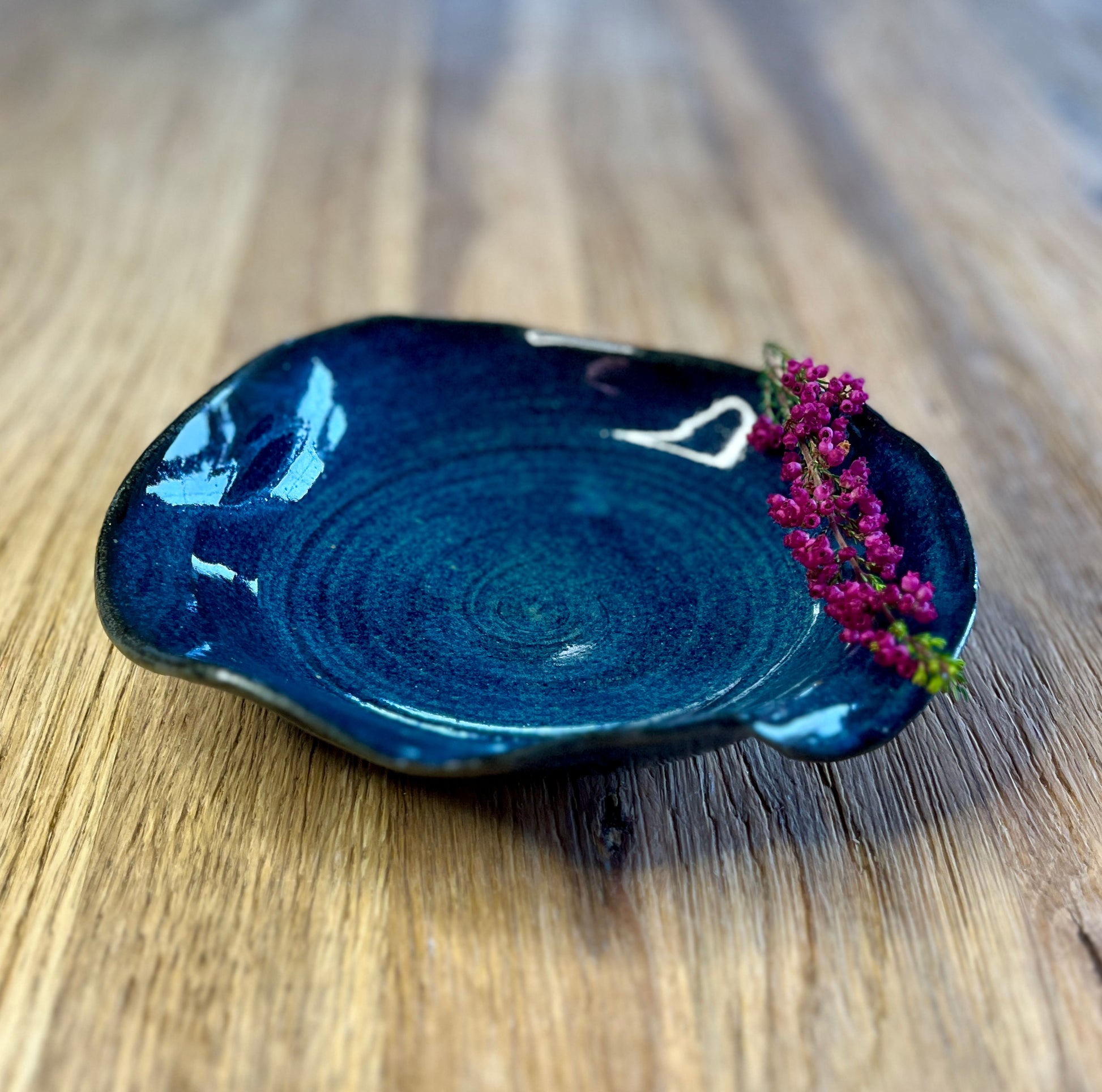 Organisk unika skål til slik og snacks. Skålen er hånddrejet i sort stentøjsler, bearbejdet med hænderne til denne organiske form og til sidst glaseret med havblå glasur.