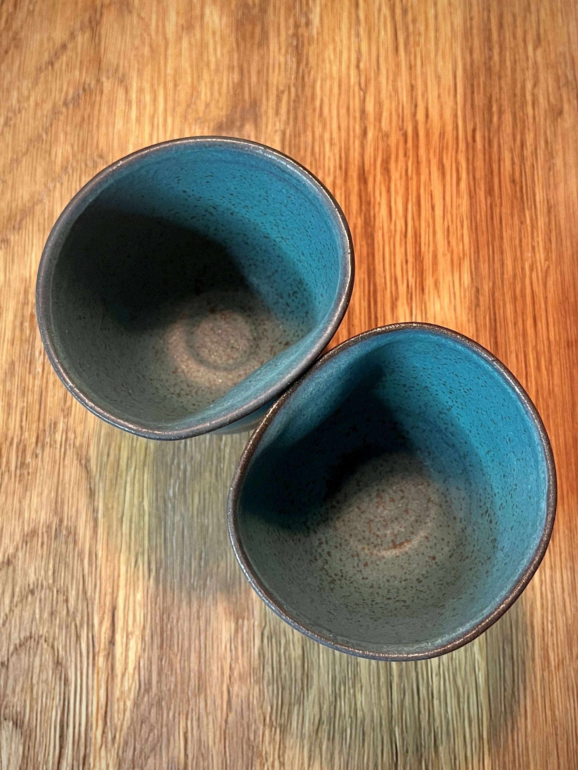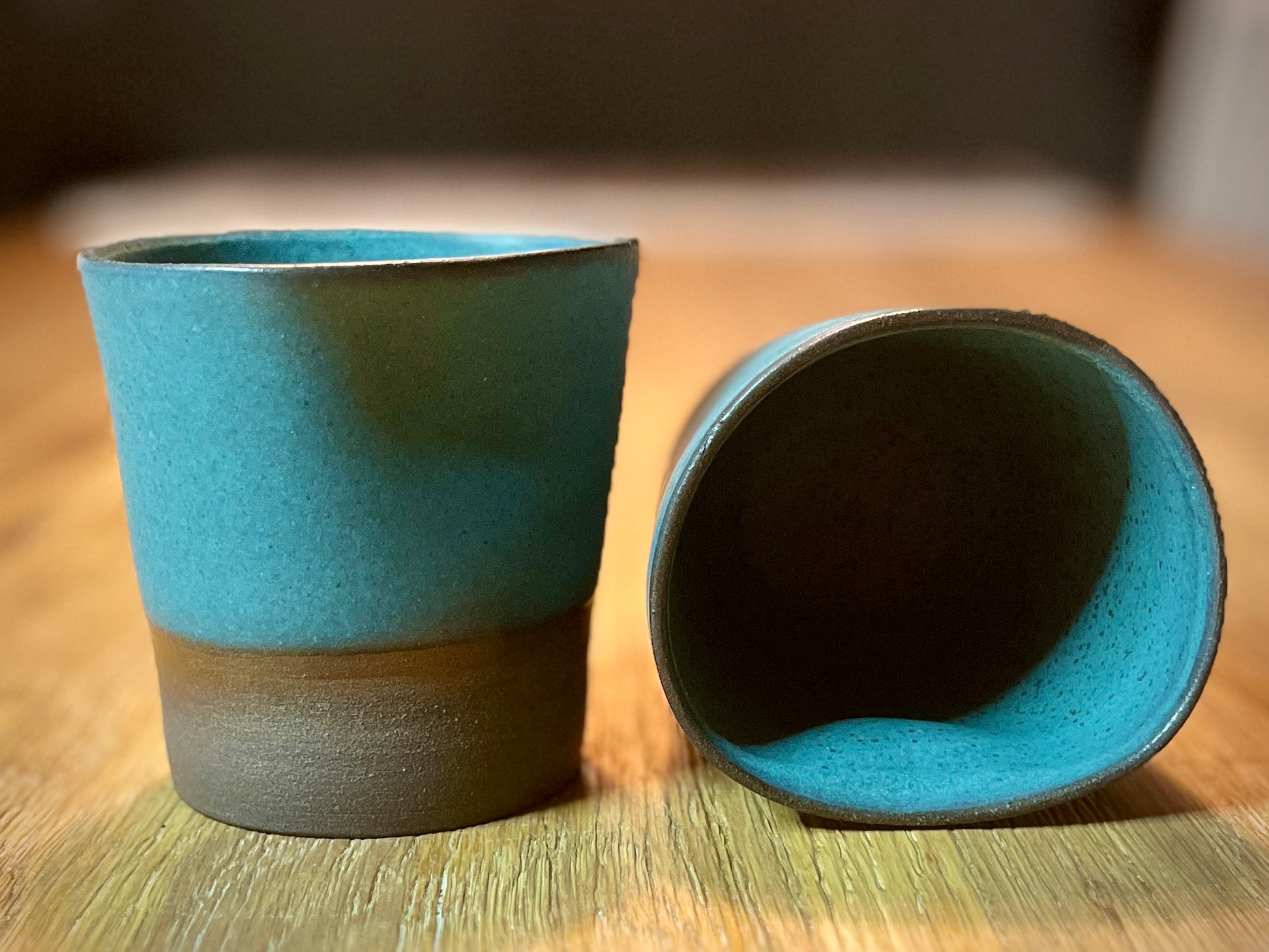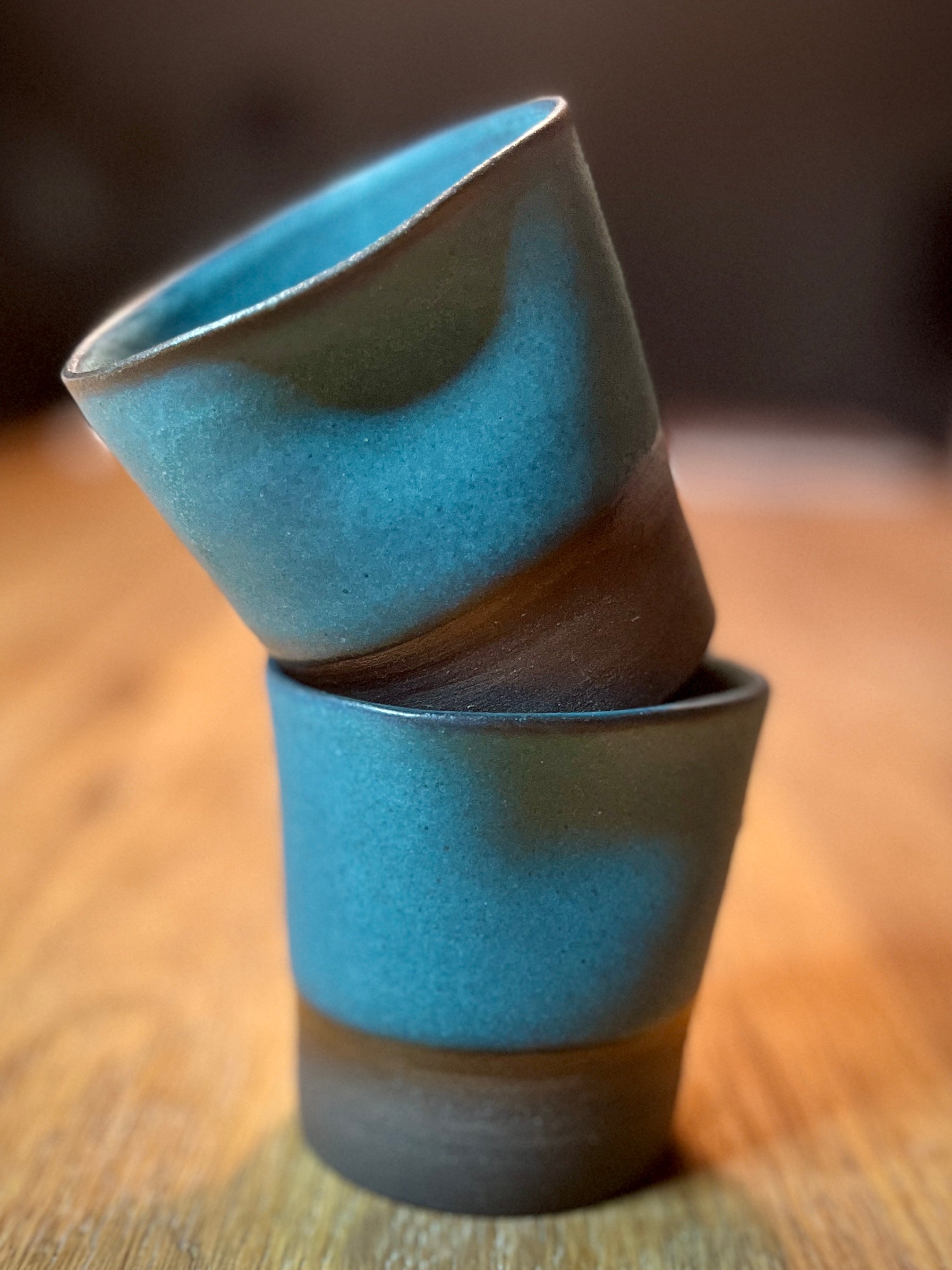 Hånddrejet keramik krus i sort stentøjsler med turkis glasur.