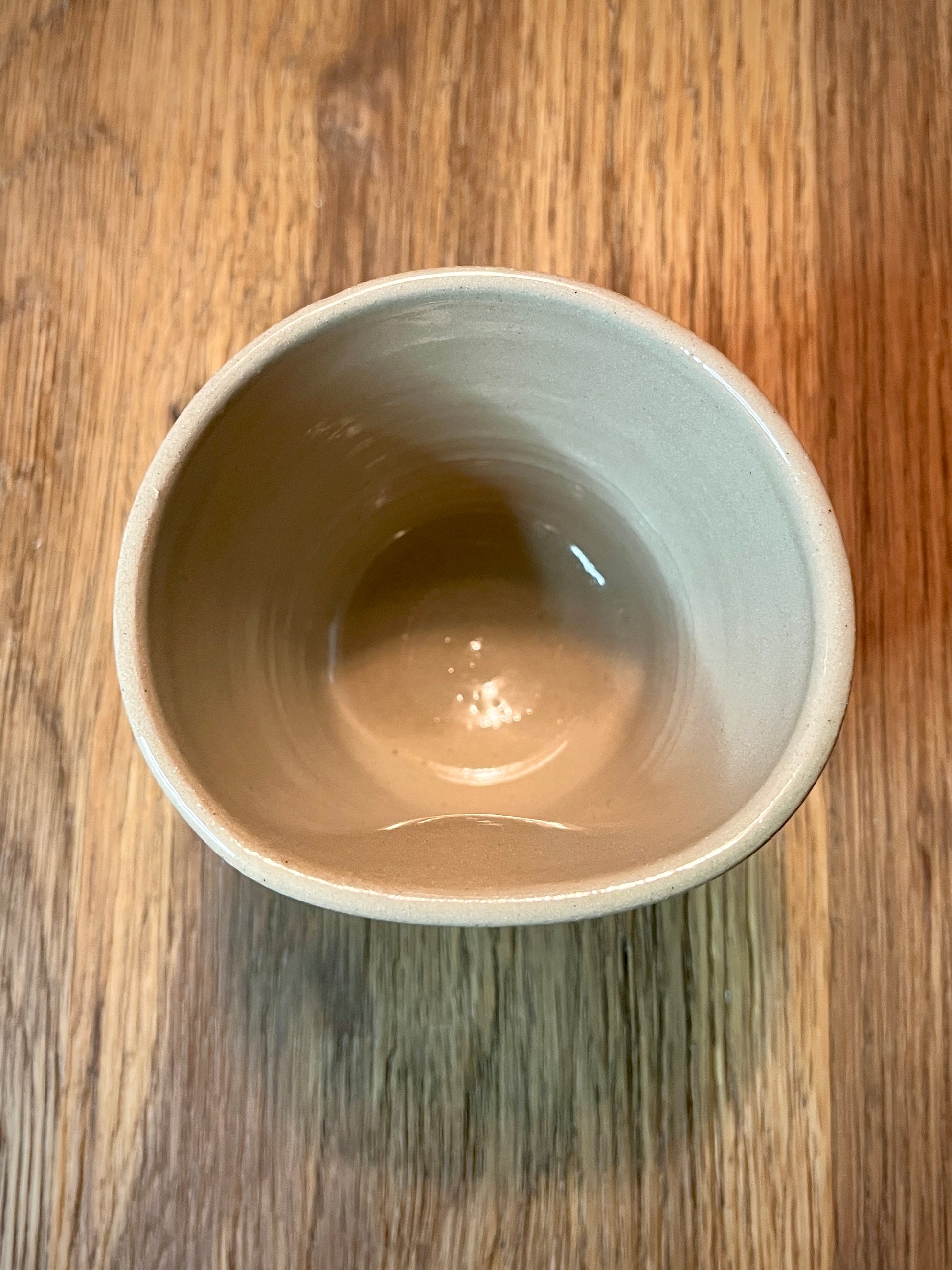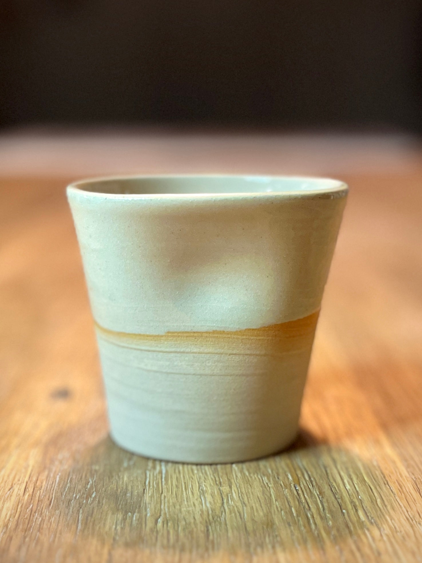 Hånddrejet keramik krus i sort stentøjsler med beige glasur.