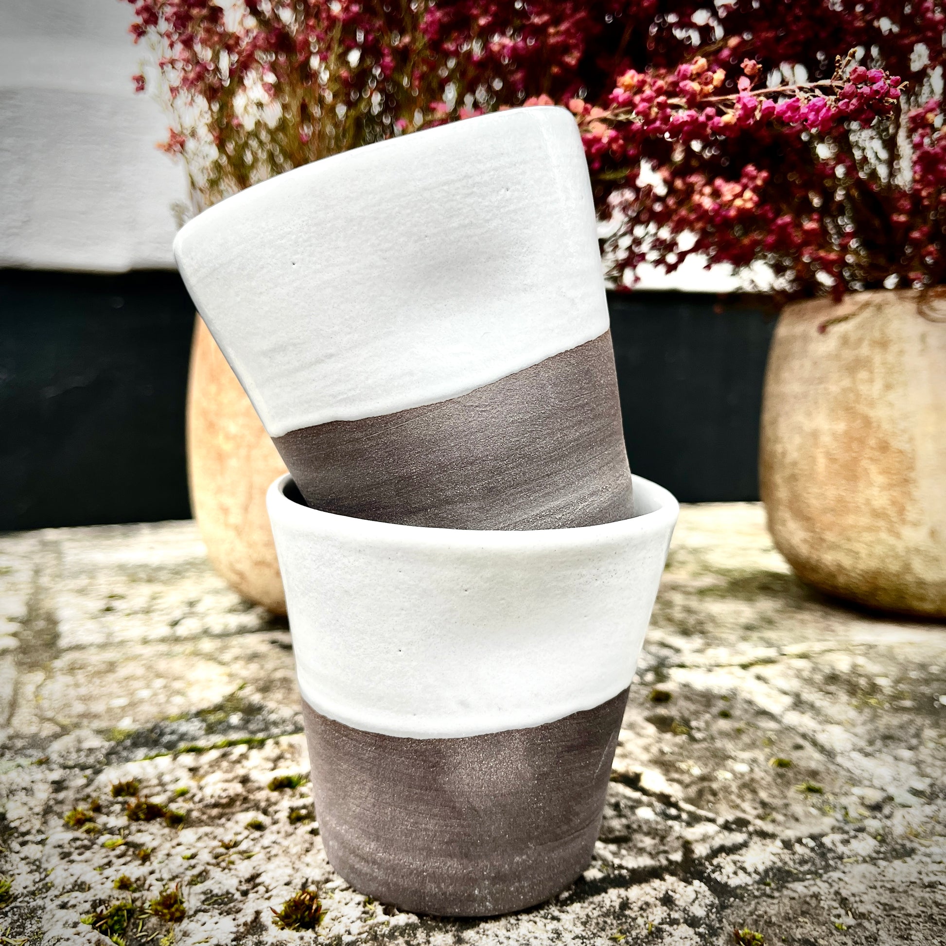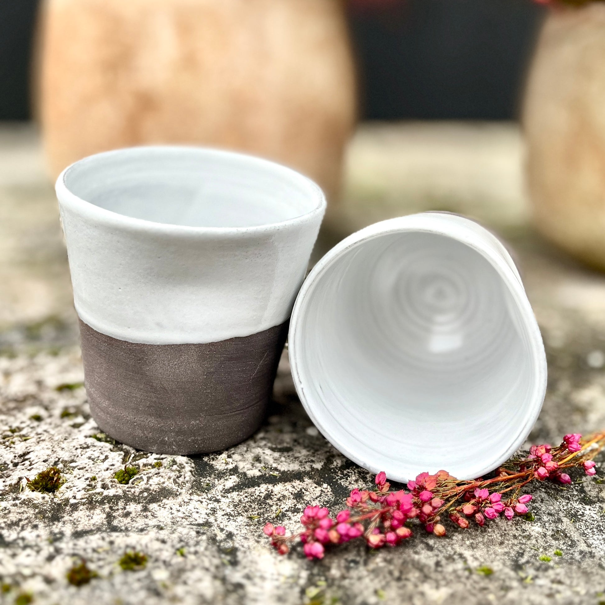 Hånddrejet keramik krus i sort stentøjsler med hvid glasur.