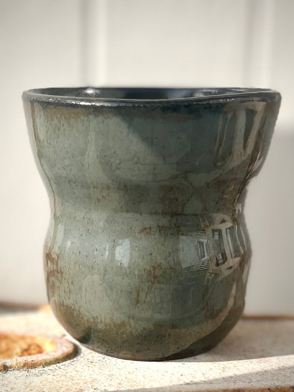 Hånddrejet keramik krus i sort stentøjsler med glasur i blågrå og brunlige nuancer.