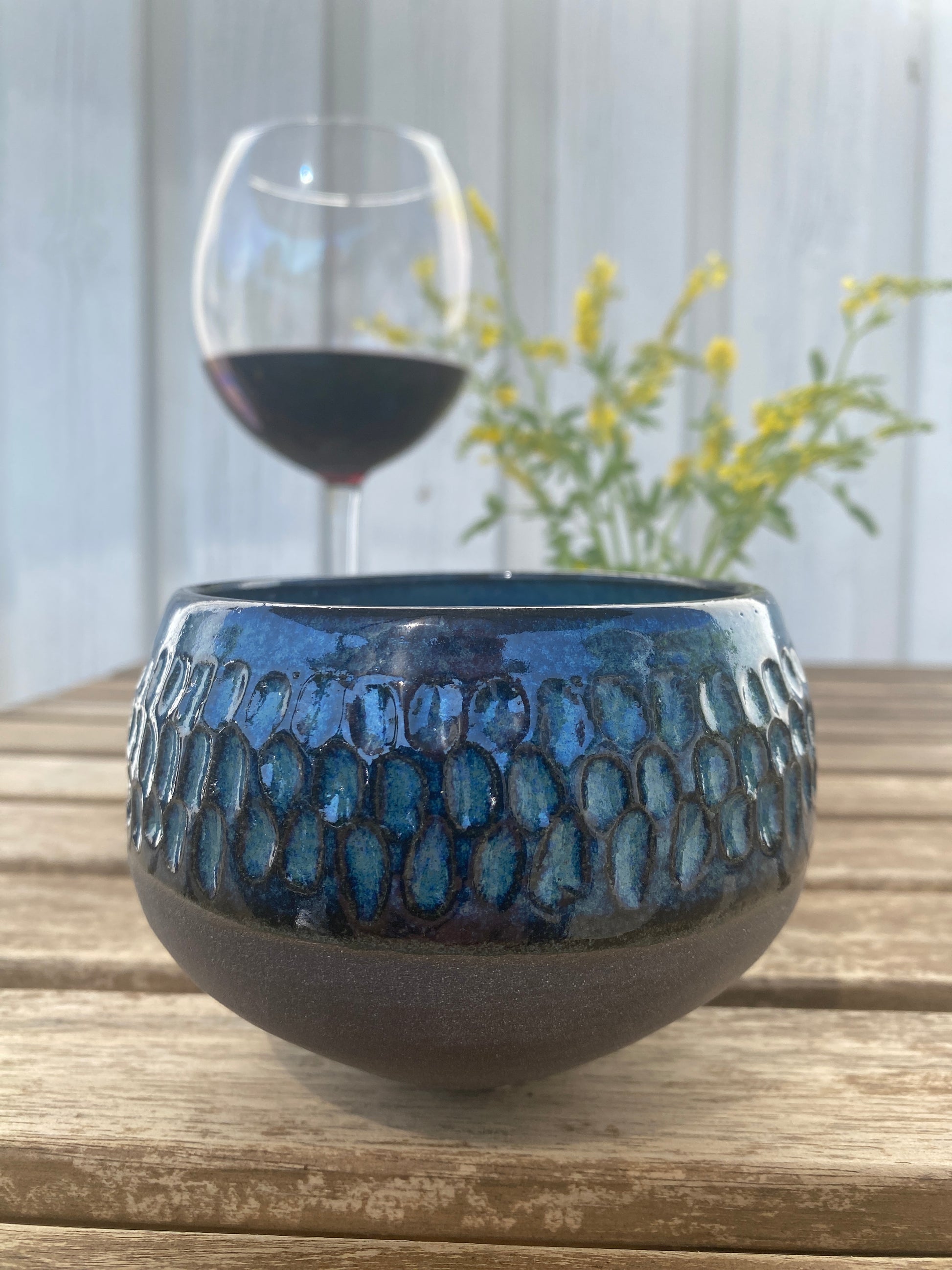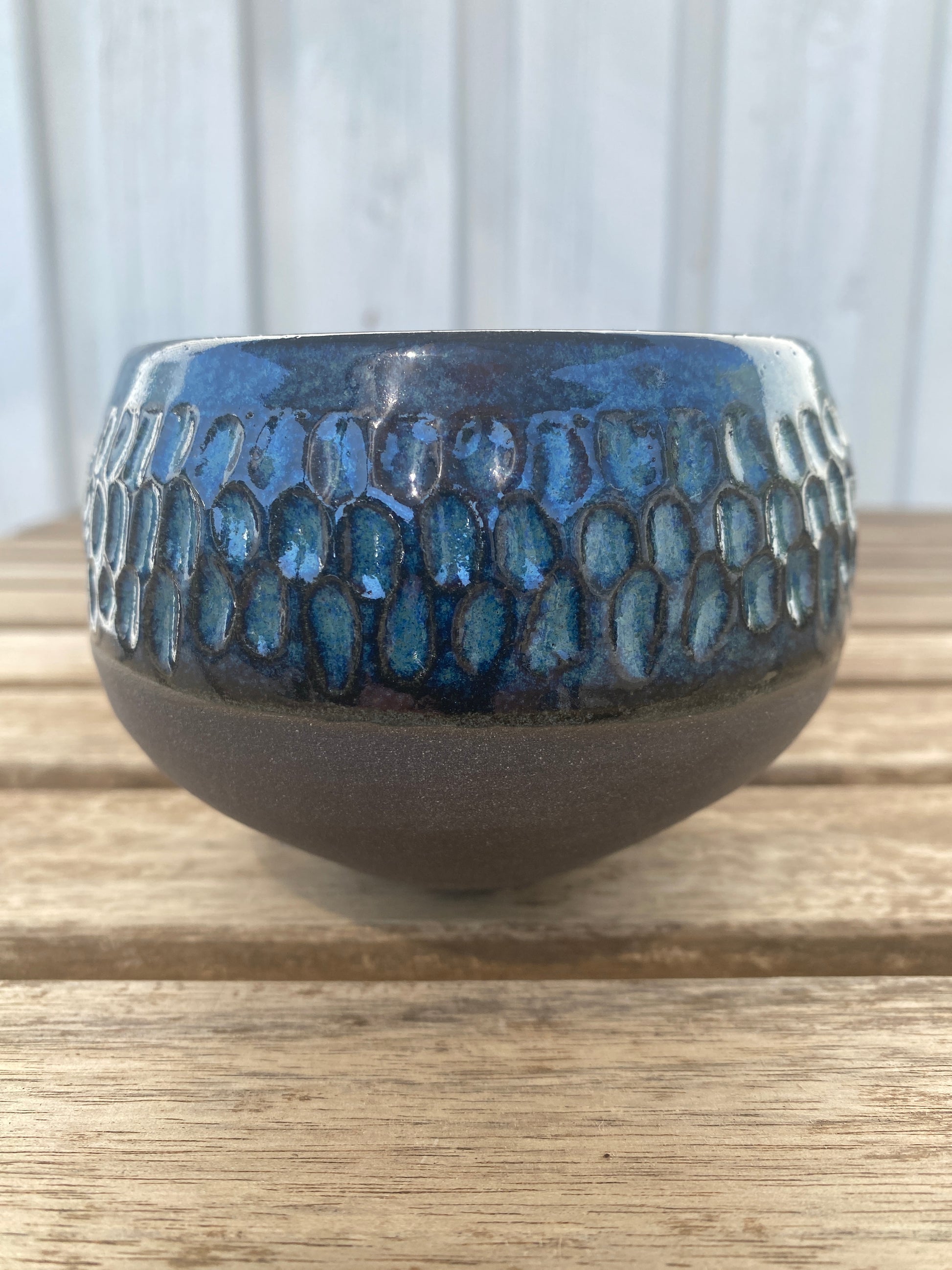 Håndlavet keramik i sort stentøjsler med dybblå glasur.